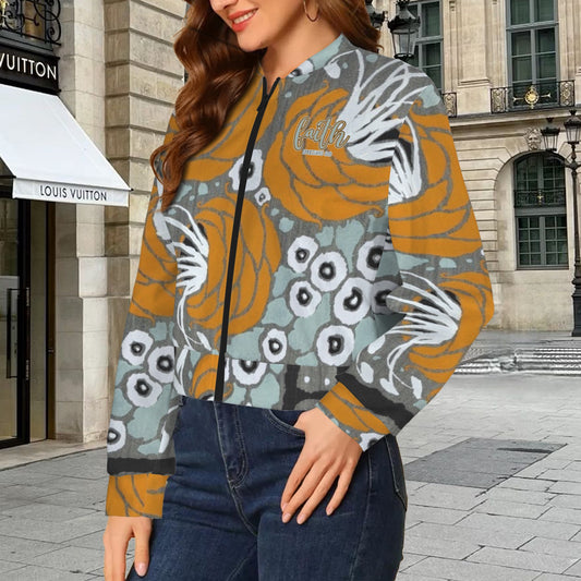 "Faith Ephesians 2:8" Blue Orange White Floral Casual Long Sleeve Zip-Up Bomber Jacket
