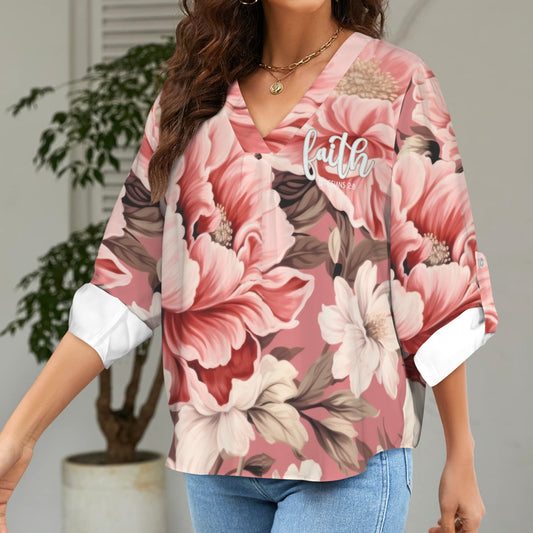 "Faith " Pink &White Floral Women's V-Neck Cuffed Sleeve Blouse Tops
