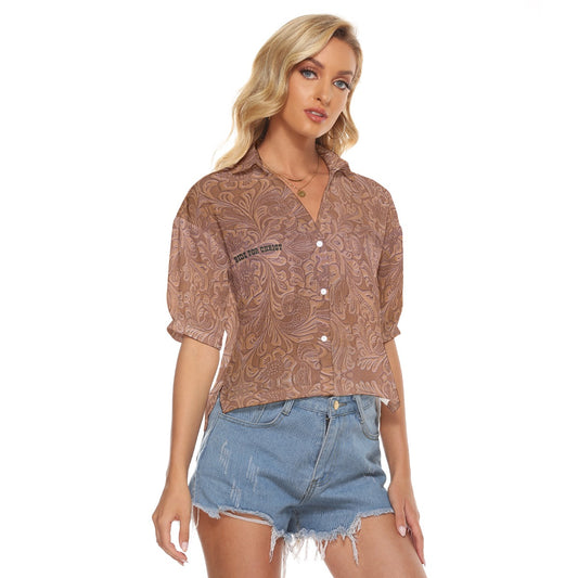 "Ride for Christ" Brown Tooled Leather Print Women's V-neck Shirts