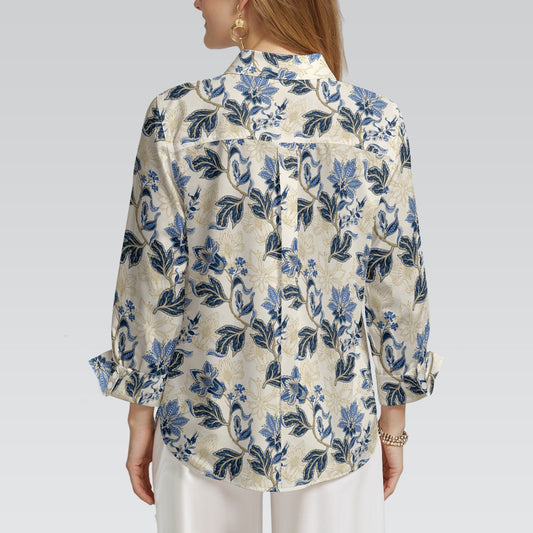 "Repent & Believe" Blue Floral Women's 3/4 Sleeve Button-Down Shirt - Lightweight Polyester Blend