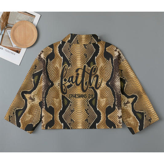 "Faith Ephesians 2:8" Faux Snake Skin Print Women's Cropped Jacket | 245GSM Cotton