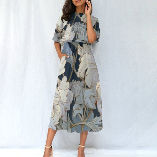 "Faith Ephesians 2:8" Blue & White Floral Short Sleeve Pocket Elastic Waist Causal Dress