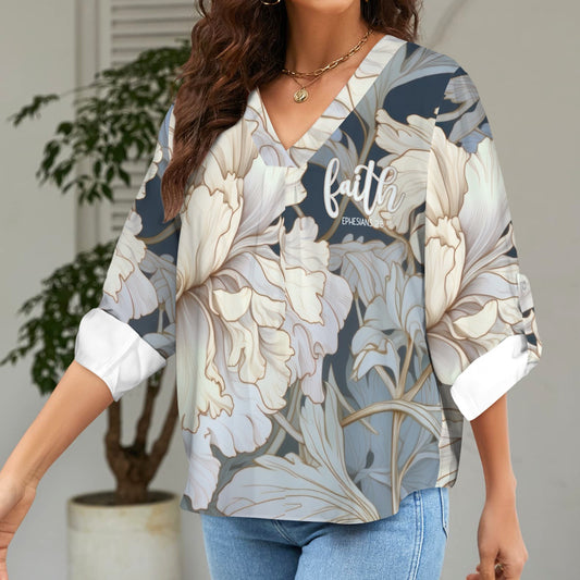 "Faith Ephesians 2:8" Blue & White Floral Women's V-Neck Cuffed Sleeve Blouse Tops