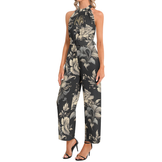 "Faith Ephesians 2:8" Black & Cream Floral Halter Neck Buckle Belted Jumpsuit