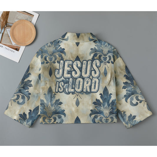 "Jesus is Lord" Blue & Beige Damask Pattern Women's Stylish Cropped Denim-Inspired Cardigan, Pure Cotton | 245GSM