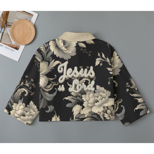"Jesus is Lord" Black & Beige Floral Women's Cropped Jacket | 245GSM Cotton