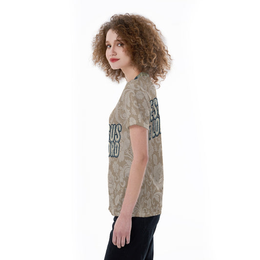 "Jesus is Lord" Beige Floral Pattern with Blue & Beige Damask Pattern Collar All-Over Print V-neck Women's T-shirt