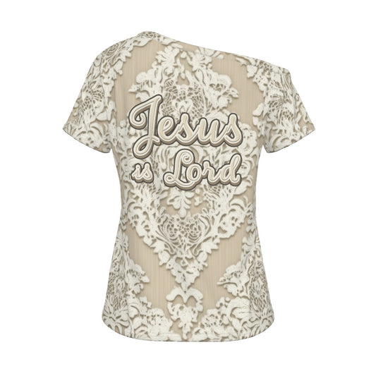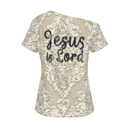 "Jesus is Lord" Faux Ivory Lace Women's Off-Shoulder T-shirt