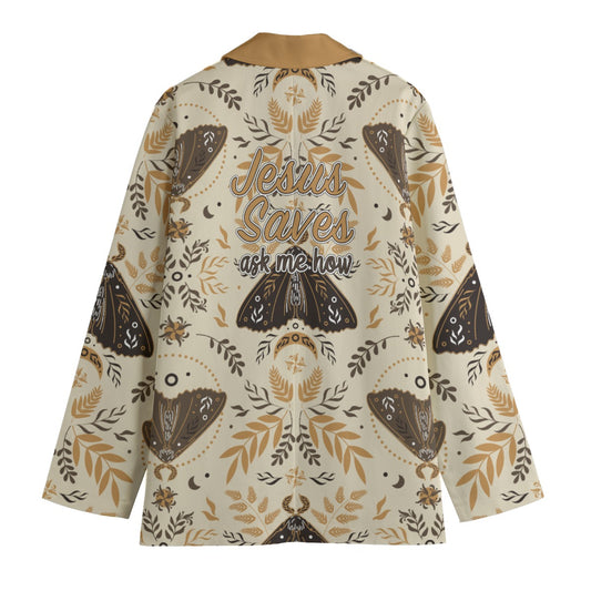 "Jesus Saves ask me how" Beige & Brown Moth Pattern Women's Leisure Blazer