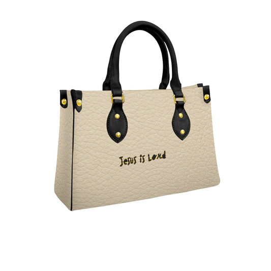 "Jesus is Lord" Faux Cream Leather Women's Tote Bag With Black Handle