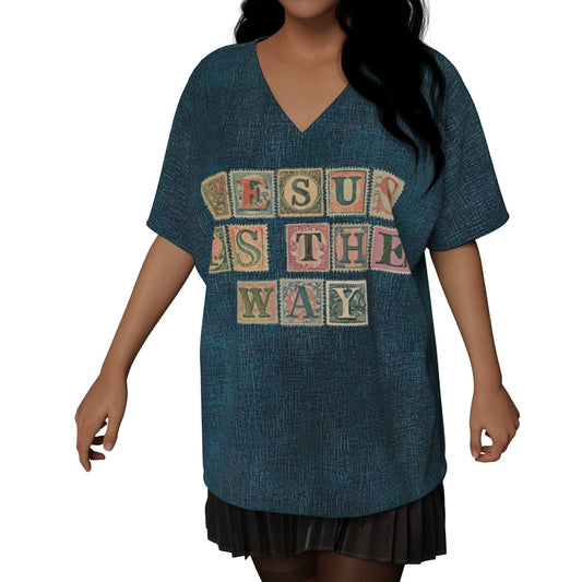 "Jesus is the way" Faux Denim look Women's Jersey Bat Sleeve V-Neck Blouse - Loose Fit for Comfort