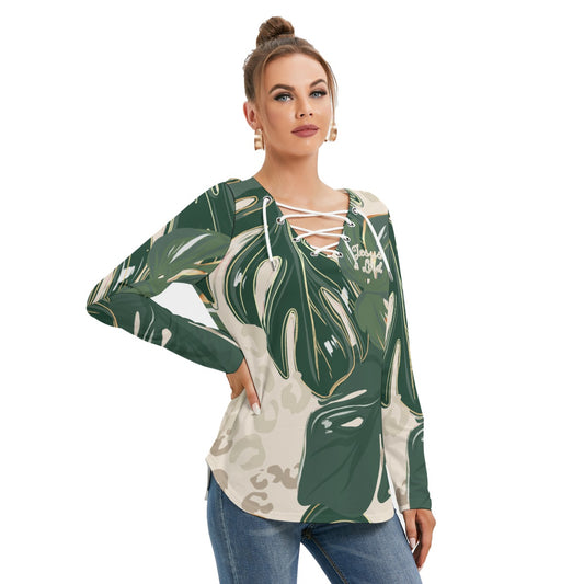 "Jesus is Lord" Green Monstera Floral Women's Long Sleeve Neckline Tie Sweatshirt
