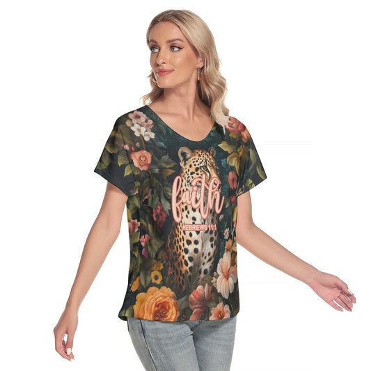 Leopard Floral Print Women's Loose V-neck Short Sleeve T-shirt "Faith Hebrews 11:1"