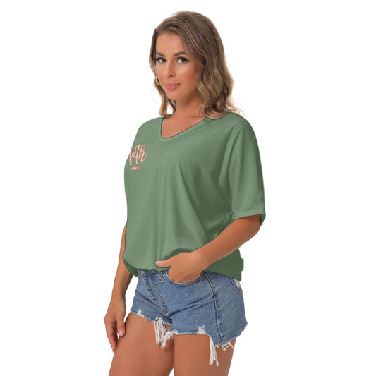 Green Women's Bat Sleeves V-Neck Blouse Faith Hebrews 11:1 Loose Comfort Jersey Top