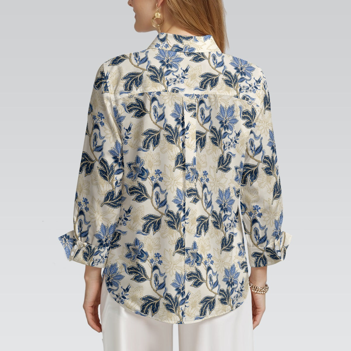 A stylish and faith-inspired women's shirt perfect for office wear or casual outings, featuring the bold 'Repent & Believe' text on the left chest of an elegant blue floral design. Crafted for comfort and versatility, this button-down top combines a tailored fit with breathable, wrinkle-resistant fabric that moves seamlessly from workday meetings to weekend gatherings.