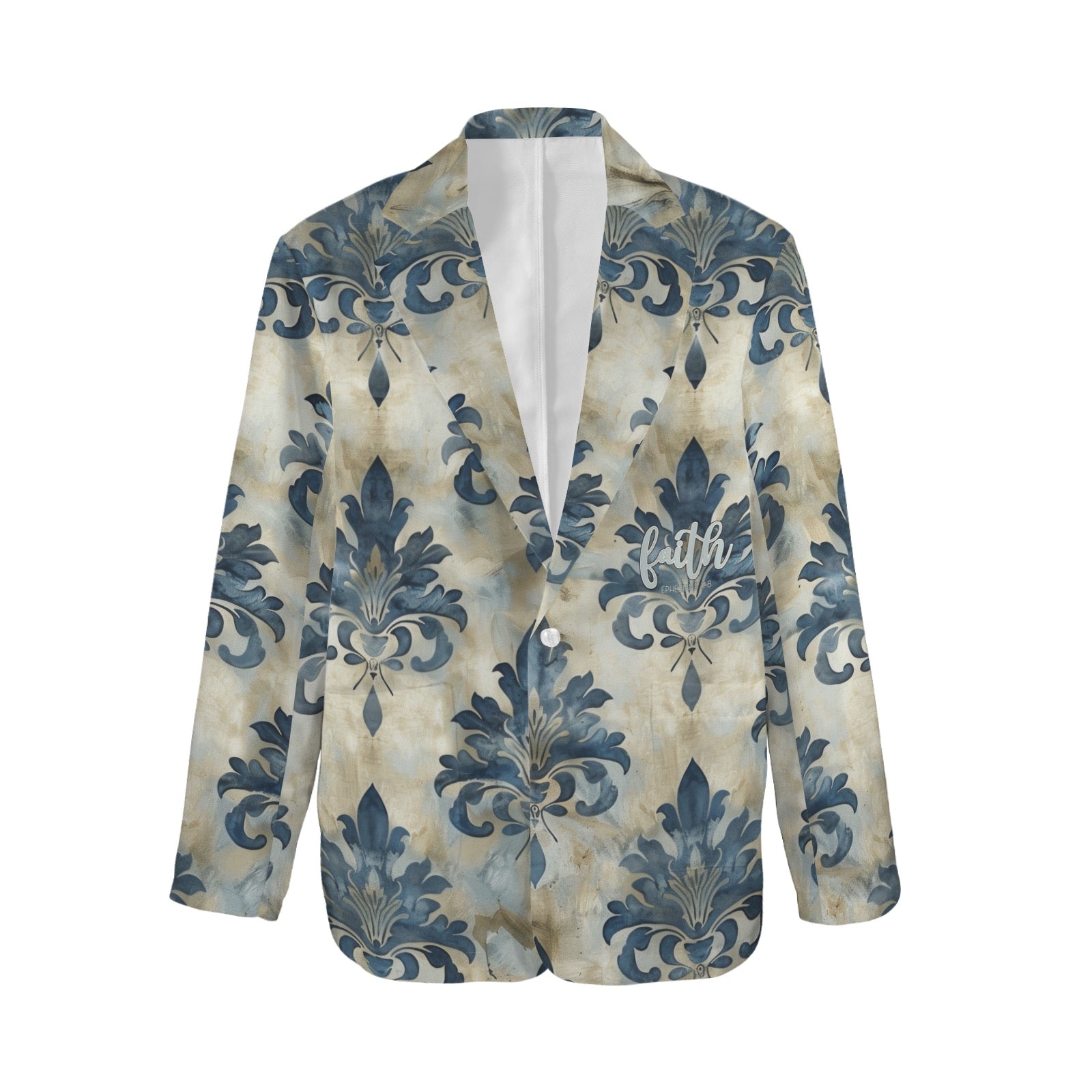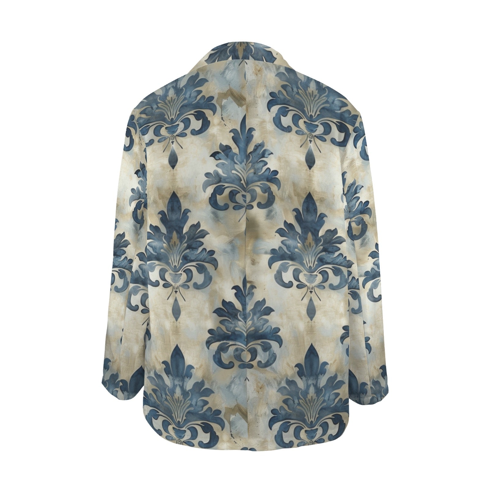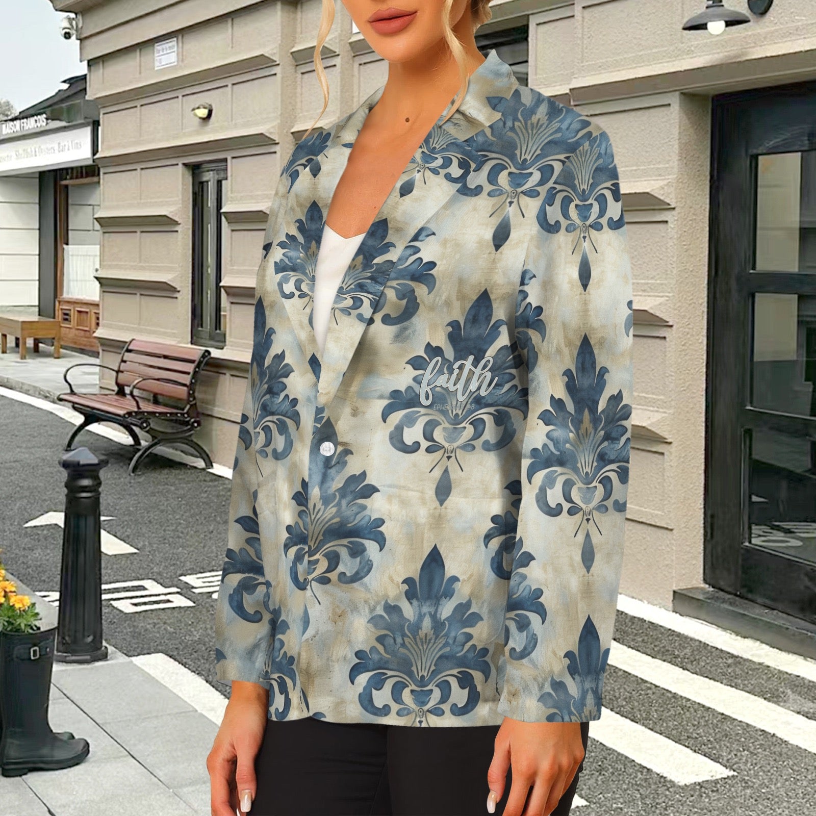 "Faith Ephesians 2:8" Faux Distressed Blue Damask Women's Open Front Casual Long Sleeve Blazer
