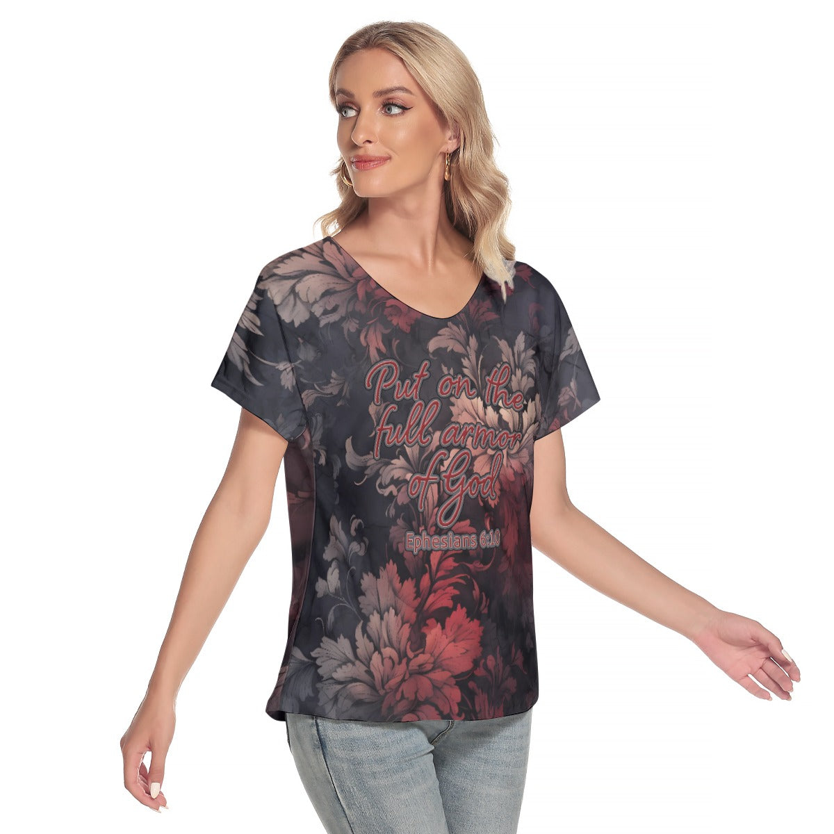 "Put on the full armor of God" Red & Gray Floral Women's Loose V-neck Short Sleeve T-shirt
