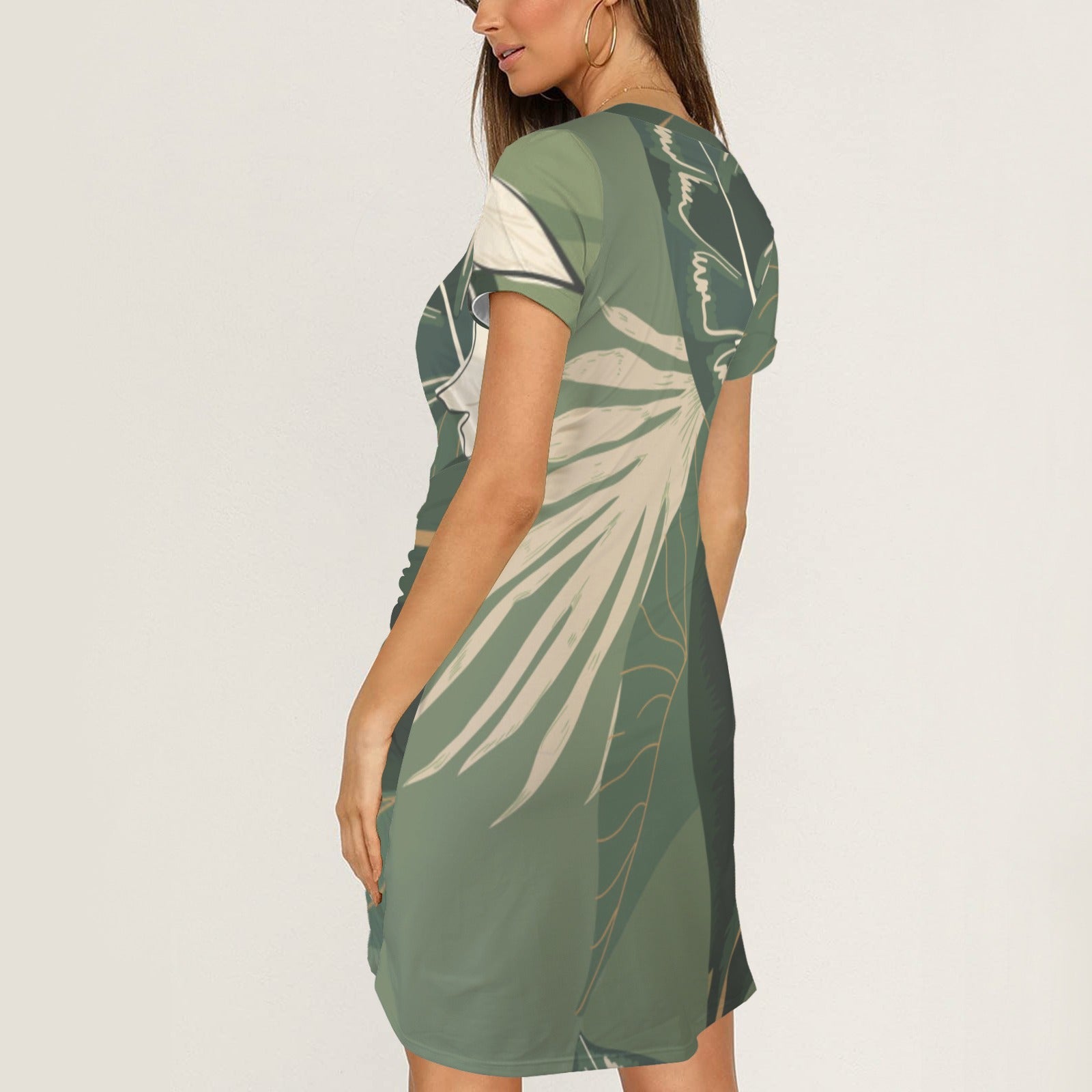 Repent & Believe Green Leaf. Short Sleeve Wrap Bodycon Ruched Tie Waist Dress