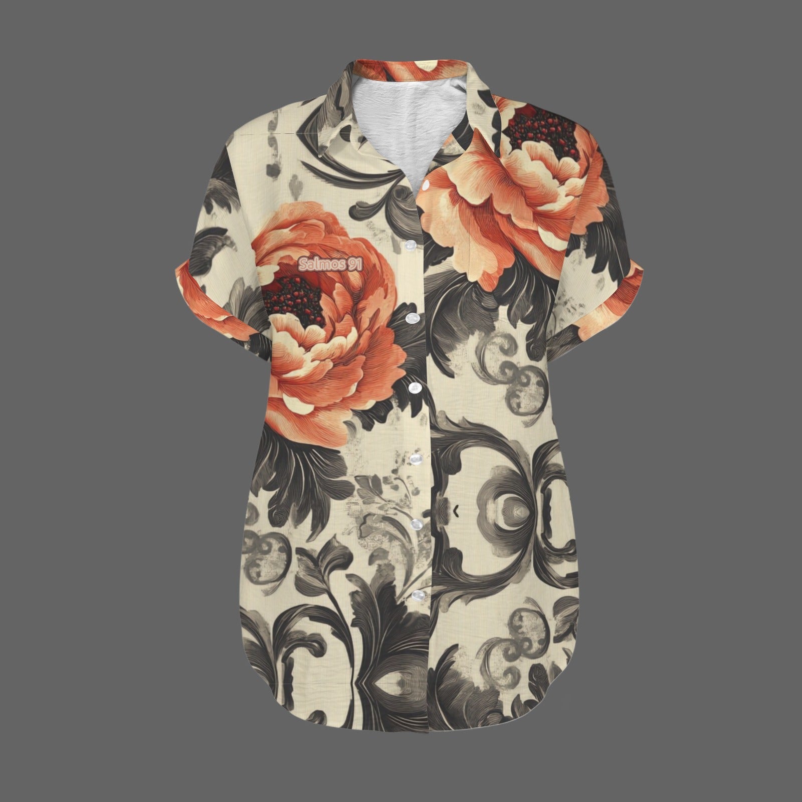 "Salmos 91 salmon" Floral Women's Short Sleeve Button Pocket Blouse